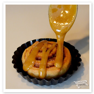 4. Cuando la salsa esté lista, glasea tus rollos con ella. Debes hacerlo rápido y con cuidado de no quemarte. Al enfriarse se irá poniendo espesa y dura, como los caramelos de toffee. No te preocupes porque a la hora de comerlos, se pueden calentar en el microondas o incluso, si la temperatura no es demasiado fría, se pone más blandito por el calor.